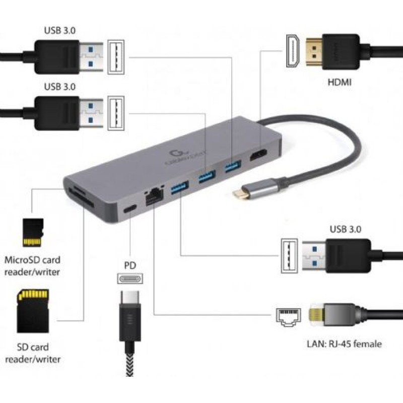 Gembird USB-C Hub for HDMI 1xUSB-C GbE 2xUSB-A Card PD